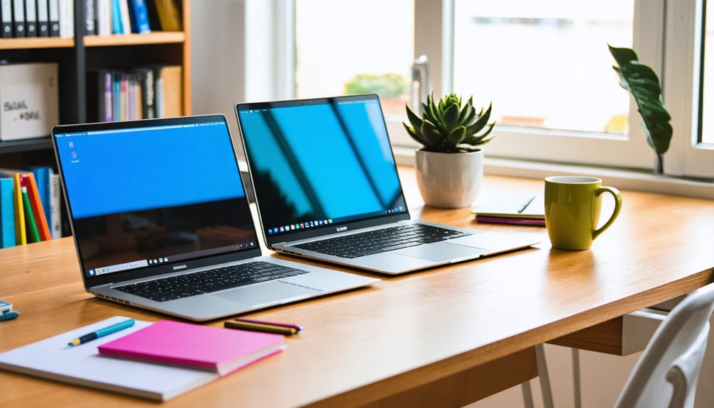 Understanding the performance specifications lays the groundwork for selecting a suitable laptop, but price plays a substantial role in the decision-making process for students. Budget planning begins with identifying various price range options, which can substantially influence choice. Ultra-budget laptops under $200 include models like the HP 14″ Laptop at $119.99, while entry-level devices ($200-$350) such as the ASUS Vivobook Go start at $254. Mid-range options ($350-$500) like the Lenovo IdeaPad deliver adequate specifications for college needs. Higher-end budget ranges ($500-$700) provide powerful processors for demanding tasks. Finally, premium models, ranging from $700-$1000, often come with Lenovo Student Discount Laptops making them more accessible. Budget and cheap laptops are available for students to ensure they have the technology they need without overspending. Price comparisons across these categories guarantee students maximize their technology investments.